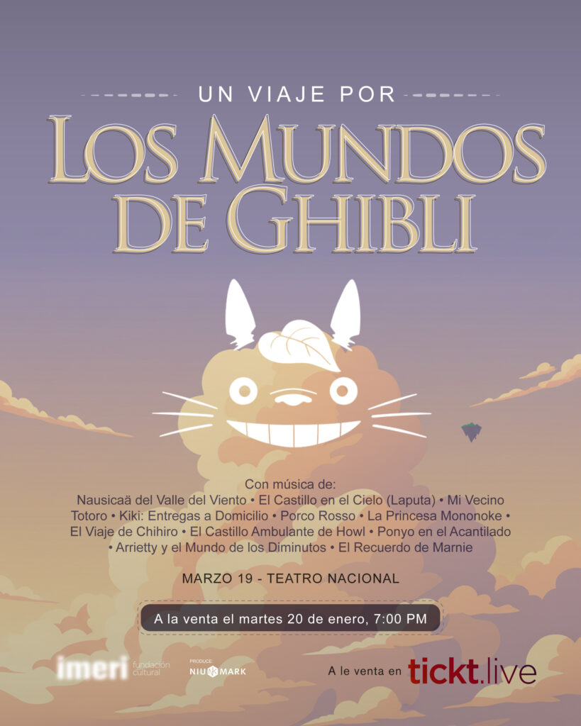 La música que ha dado vida a algunas de las historias más entrañables del cine animado llegará al país con el concierto sinfónico “Un viaje por los mundos de Ghibli”, un espectáculo que rinde homenaje a las composiciones de Studio Ghibli. El repertorio incluirá piezas emblemáticas de películas como Mi vecino Totoro, El viaje de Chihiro, Nausicaä del Valle del Viento, La princesa Mononoke, El castillo ambulante de Howl, Porco Rosso, Ponyo en el Acantilado, Arrietty y el Mundo de los Diminutos, El recuerdo de Marnie y El castillo en el cielo, entre otras.