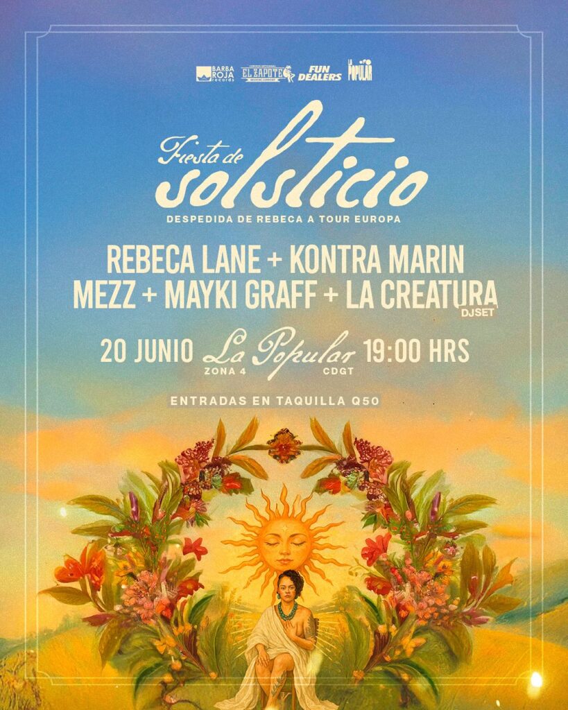 Prepárate porque este 20 de junio se celebra la fiesta del solsticio en ciudad de Guatemala un concierto creado para despedir a nuestra queridísima Rebeca Lane quién en poco tiempo se irá de gira a Europa y esta vez para despedirse tendremos un mega concierto con un Lineup de lujo con artistas como Kontra Marín, Mezz, Mayki Graff y como invitado especial Gerry Esko también contaremos como un DJ Set por la creatura así que prepárate para vivir una noche increíble.